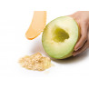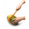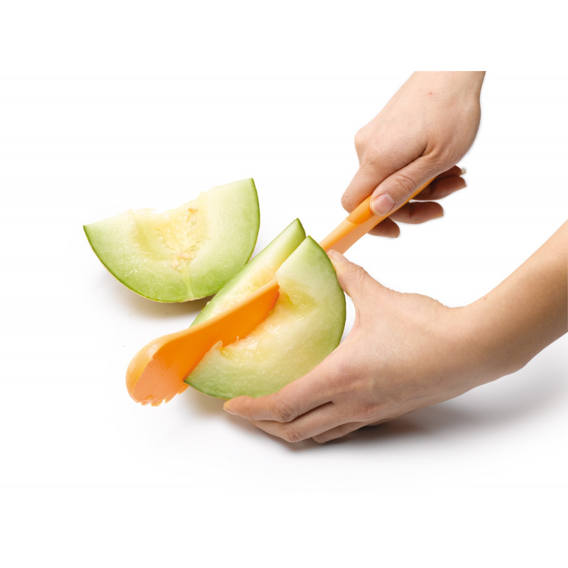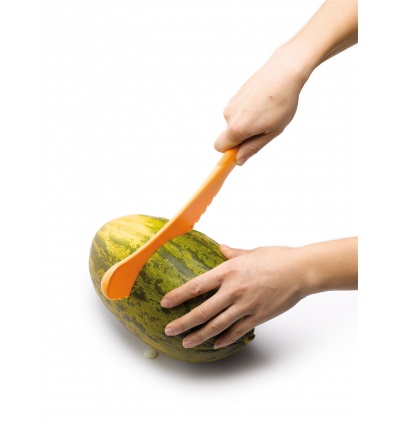 Нож за пъпеши, представляващ четири инструмента в едно - срязване на пъпеша наполовина, лъжичка за отстраняване на семената, приспособление за премахване на кората и резените.