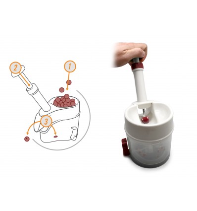 Приборът за вадене на костилки много лесно, само с едно натискане, изважда костилката от плода, с помощта на стоманен нож в края на буталото. Разполага с вакуум в долната си част, с помощта на който се закрепва здраво и неподвижно към гладки повърхности. Ножът е конструиран така, че да не мачка плодовете, а да ги изважда цели и почистени. Костилките се събират във подвижен контейнер, така че няма вероятност да попаднат случайно при почистените плодове.