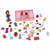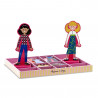 С този комплект децата ще са стилистите на двете приятелки. В него има 2 фигурки на момичета, 2 стойки за тях и 56 части на дрехи, които стават и на двете. Правете комплекти, миксирайте отново и отново. След края на играта всички части се прибират в здравата дървена кутия.