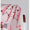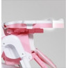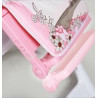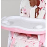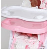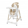 Това столче притежава всички характеристики на качественото изделие. То е с PVC покритие, което гарантира лесното поддържане и почистване на облегалката и седалката. Горната отстраняема табла е с места за чаши и шишета, което допринася за стабилността на изделието. Освен това, тази част може да се махне, което позволява използването на столчето и при по-големи деца, или превръщането му от място за хранене в място за игра. Несъмнената практичност на продукта се допълва от възможността за регулиране на плота, облегалката и седалката – това дава дълъг живот на изделието и осигурява комфорта на детето при ползване. Нуждата от сигурност при хранене е защитена с предпазните коланчета. А лесното сгъване и разгъване и колелцата за придвижване са безспорно предимство за родителя. Столчето се предлага в свежи тонове, декорирани със забавни щампи.
