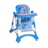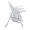 Това столче притежава всички характеристики на качественото изделие. То е с PVC покритие, което гарантира лесното поддържане и почистване на облегалката и седалката. Горната отстраняема табла е с места за чаши и шишета, което допринася за стабилността на изделието. Освен това, тази част може да се махне, което позволява използването на столчето и при по-големи деца, или превръщането му от място за хранене в място за игра. Несъмнената практичност на продукта се допълва от възможността за регулиране на плота, облегалката и седалката – това дава дълъг живот на изделието и осигурява комфорта на детето при ползване. Нуждата от сигурност при хранене е защитена с предпазните коланчета. А лесното сгъване и разгъване и колелцата за придвижване са безспорно предимство за родителя. Столчето се предлага в свежи тонове, декорирани със забавни щампи.