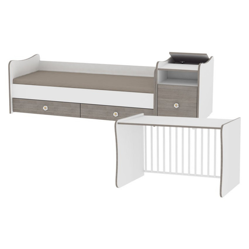 • леглото може да се трансформира в: А - юношеско легло, ученическо бюро, многофункционален шкаф; В - бебешко легло; юношеско легло, многофункционален шкаф