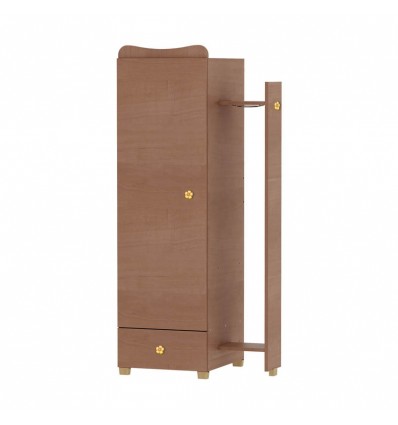 Комбиниран с легло, гардеробът създава свеж и приятен интериор на детската стая, който освен това допълва практичността и многофункционалността на продуктите. Гардеробът е еднокрилен, с чекмедже и рафт с три нива. Външният модул е с два рафта и закачалки. Сериозно улеснение е възможността за ляво и дясно монтиране.