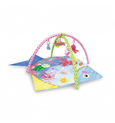 0+ месеца Пъстроцветен тепих с форма на рибка и изображения на морското дъно. В комплекта има 3 пластмасови дрънкалки: морско конче, рибка, жабка - като жабката е и гризалка + 1 плюшена играчка-октопод, свиреща и нечупливо огледалце. Опакован в цветна подаръчна кутия. В един кашон 6 бр.