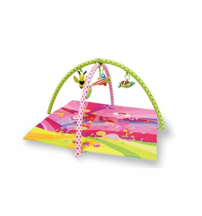 0+ месеца Пъстроцветен тепих с приказни животни под дъгата в розово. В комплекта има 3 пластмасови дрънкалки: рибка, кравичка, пеперуда - като пеперудата и кравичката са и гризалки + 1 плюшена играчка-зайче, свиреща и нечупливо огледалце. Опакован в цветна подаръчна кутия. В един кашон 6 бр.
