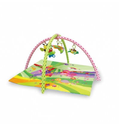 0+ месеца Пъстроцветен тепих с приказни животни под дъгата в зелено. В комплекта има 3 пластмасови дрънкалки: ябълка, кравичка, пеперуда - като пеперудата и кравичката са и гризалки + 1 плюшена играчка-делфин, свиреща и нечупливо огледалце. Опакован в цветна подаръчна кутия. В един кашон 6 бр.