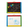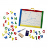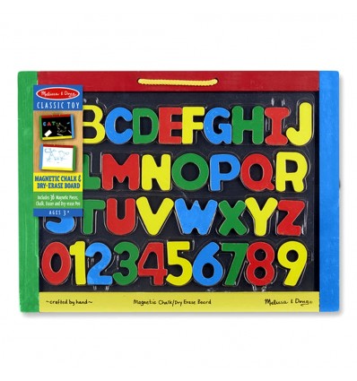От едната страна е черна дъска на която може да се пише с тебешир и да се трие, от другата е магнитна дъска върху която могат да се залепват буквички. В каквото и настроение да е малкия творец - винаги ще намери начин да се занимава с дъската. Тя е лесно преносима. В комплекта ще намерите 3 цветни тебешира, маркер за бялата дъска и 36 магнитни букви и цифри.