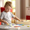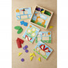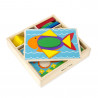Комплекта съдържа 5 двустранни борда с 10 цветни шаблона, готови за поставяне на фигурките върху него. Детето трябва да съобрази формата и цвета на фигурките в кутията с това, което има пред себе си като цветен шаблон. То може да завършва шаблоните или да създава свои творения. Всичко от комплекта се съхранява удобно в практичната дървена кутия.