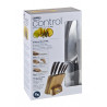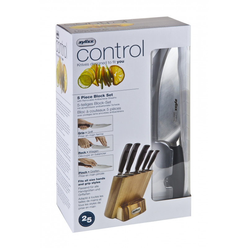 Всички ножове са изработени от висококачествена немска неръждаема стомана, която осигурява перфектни резултати при рязане. Ножовете от серия ZYLISS CONTROL са проектирани така, че да отговарят на различните стилове на рязане - стандартно нарязване или нарязване чрез люлеене с две ръце. Специално проектираната зона на върха на острието е предназначена за лесно и контролирано "люлеене" при рязане с две ръце, а другата зона / при дръжката / подсигурява комфорт на палеца / показалеца при рязане.