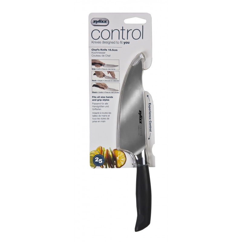 Всички ножове са изработени от висококачествена немска неръждаема стомана, която осигурява перфектни резултати при рязане. Ножовете от серия ZYLISS CONTROL са проектирани така, че да отговарят на различните стилове на рязане - стандартно нарязване или нарязване чрез люлеене с две ръце. Специално проектираната зона на върха на острието е предназначена за лесно и контролирано "люлеене" при рязане с две ръце, а другата зона / при дръжката / подсигурява комфорт на палеца / показалеца при рязане.