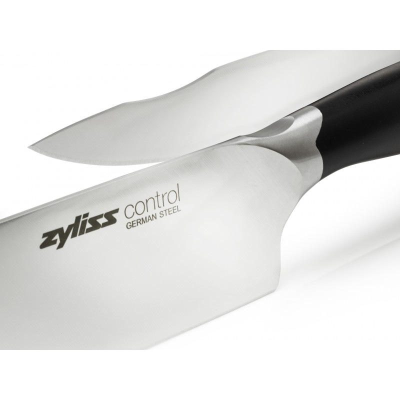 Всички ножове са изработени от висококачествена немска неръждаема стомана, която осигурява перфектни резултати при рязане. Ножовете от серия ZYLISS CONTROL са проектирани така, че да отговарят на различните стилове на рязане - стандартно нарязване или нарязване чрез люлеене с две ръце. Специално проектираната зона на върха на острието е предназначена за лесно и контролирано "люлеене" при рязане с две ръце, а другата зона / при дръжката / подсигурява комфорт на палеца / показалеца при рязане.
