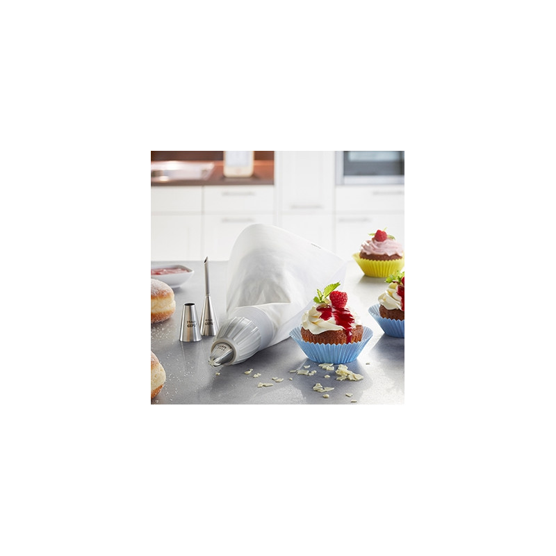 GEFU Пош / сладкарски шприц с три накрайника DECORE • Материал: неръждаема стомана, памучен плат, пластмаса • 3 бр различни накрайници Производител: GEFU / Германия