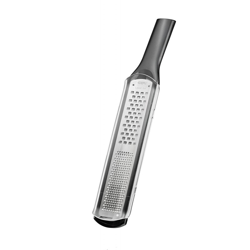 С две режещи повърхности - за по едро и за фино настъргване. За пармезан, джинджифил, шоколад, лимонова кора, канела, моркови и други твърди храни. Изключително острите лазерно изрязани остриета гарантират безпроблемно настъргване. Режещата повърхност е дълга и извита навътре, което прави настъргването бързо, ефективно и безопасно.