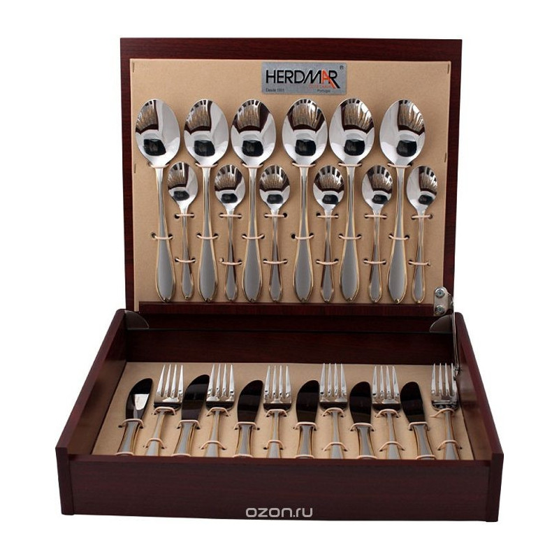Комплект прибори за хранене Herdmar "LUZIA" за 12 човека от 130 части. Изработени от неръждаема стомана и подходящи за почистване в съдомиялна машина. Комплектът включва:• Нож за хранене: 12 бр.• Вилица за хранене: 12 бр.• Лъжица за хранене: 12 бр.• Десертен нож: 12 бр• Десертни лъжици: 12 бр• Десертни вилици: 12 бр• Нож за риба: 12 бр• Вилица за риба: 12 бр• Лъжички за чай: 12 бр• Лъжичка за кафе: 12 бр• Вилица за сервиране на месо: 1 бр• Нож за сервиране на месо: 1 бр• Вилица за сервиране на риба: 1 бр• Нож за сервиране на риба: 1 бр• Лопатка за сервиране на торта: 1 бр• Черпак за супа: 1 бр• Черпак за сос: 1 бр• Лъжица за сос: 1 бр• Лопатка за сервиране: 1 бр.• Лъжица за салата: 1 бр