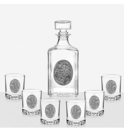 Чаши: Ø 7,2 см. , Височина чаши: 8,2 см. Височина бутилка: 24 см. Вместимост Чаши: 200 мл. Вместимост Бутилка: 1000 мл. Стилен сет за аперитив от бутилка и 6 бр. чаши, изработени от стъкло. Съдът за спиртни напитки е с класическа строга квадратна форма, която внася стил и традиция в поднасянето на напитката. Акцент е масивната стъклена запушалка. Комплектът е декориран с фина гравюра от сплав от калай и сребро във формата на метален грозд с листа. Произведен от Artina, Австрия. Предлага в луксозна синя подаръчна кутия.