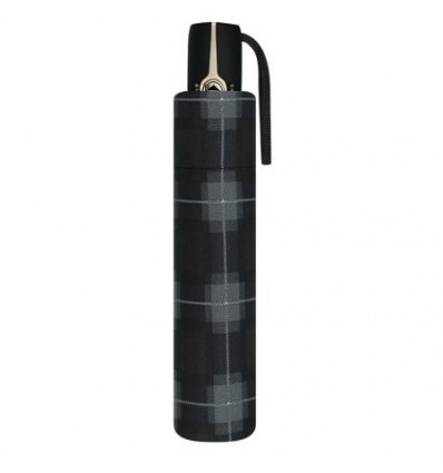 Елегантен чадър със сиви квадрати върху черен фон – носи стил и красота. Чадърът е с автоматично отваряне и затваряне, удобна дръжка и калъф при сгънато положение. Може да бъде вашият елегантен аксесоар - лек, удобен и подходящ за всяка визия, и да ви предпази от настроението на времето. Височина: 28 см. Диаметър: 100 см.