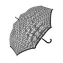 Елегантен чадър с черно-бели геометрични фигури, които му придават стил и красота, с удобна дълга дръжка .Чадърът е с автоматично отваряне, може да бъде вашият елегантен аксесоар – въпреки размерите си е лек, удобен и подходящ за всяка визия, който да ви предпази от настроението на времето. Височина: 88 см. Диаметър: 110 см.
