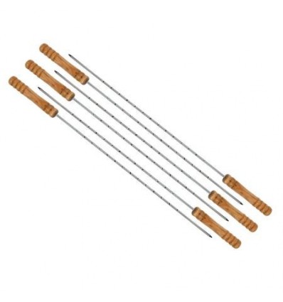 Шишовете са 6 броя, изработени от здрав стоманен материал с красива дървена дръжка за по-лесен захват. Бихте могли да си подарите един приятен престой навън сред природата – да изпиете чаша вино с любимите хора и да се насладите на прекрасен обяд и релакс с добре изпечен обяд. Размери: 420/3,5/3,5 мм