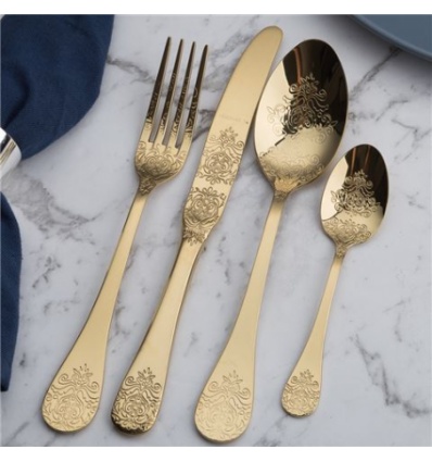 HERDMAR Комплект прибори за хранене "POMPADOUR" за 6 човека от 24 части - позлатен  • Изработени от неръждаема стомана • Подходящи за почистване в съдомиялна машина. • Позлатени с 24 каратово злато (със сертификат )  Комплектът включва: • Нож за хранене: 6 бр. • Вилица за хранене: 6 бр. • Лъжица за хранене: 6 бр. • Десертна лъжичка: 6 бр. ПРОИЗВОДИТЕЛ: HERDMAR / Португалия