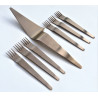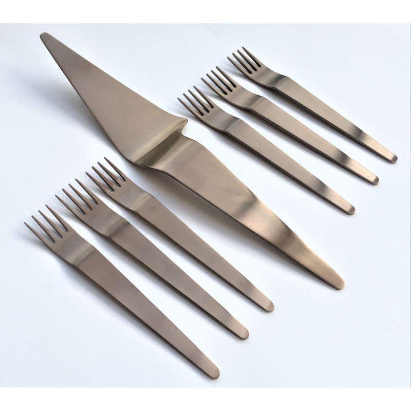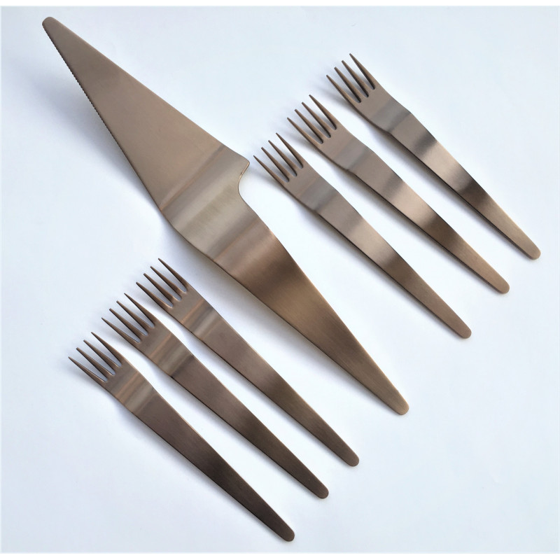 HERDMAR Комплект прибори за торта “INGA“ - 7 части - с PVD покритие шоколад/мат • Изработени от неръждаема стомана 18/10• PVD покритие. Комплектът включва:• Вилица за торта: 6 бр. • Лопатка за сервиране: 1 бр. Производител: HERDMAR / Португалия
