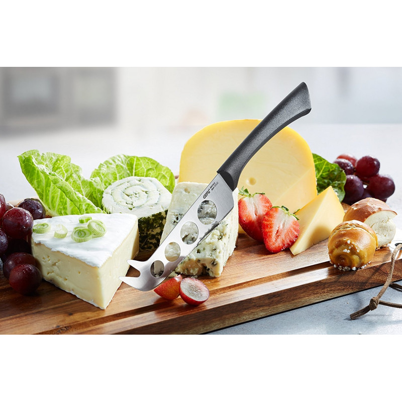 Благодарение на дупките в ножа SENSO, меките сирена като Бри или Камамбер няма да се залепват към острието, докато го нарязвате. Острите върхове на ножа са удобни за набождане на вече отрязаните парчета сирене.