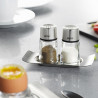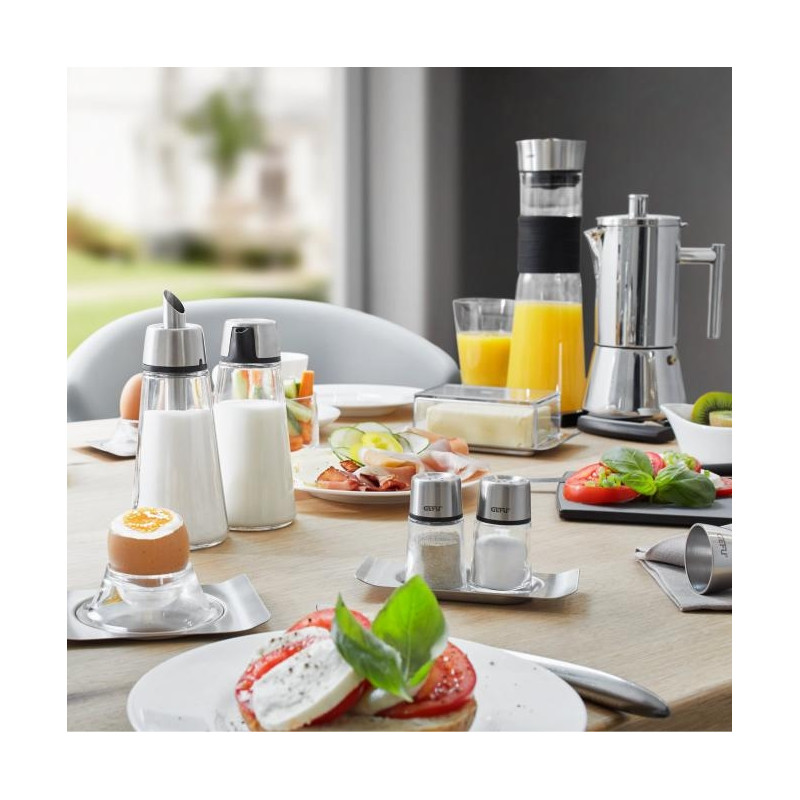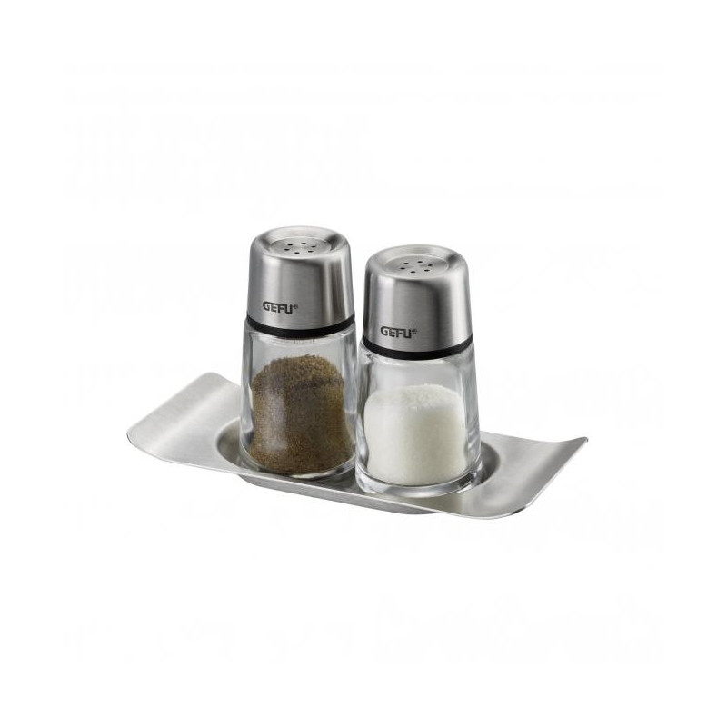 GEFU Комплект за сол и пипер BRUNCH • Материал: стъкло, неръждаема стоманa • Размери: 10,2 х 7,9 х 7 см ( Д х Ш х В) • В комплекта: 2 бр солници + 1 бр поставка • Можете да почиствате в съдомиялна машина Производител: GEFU / Германия