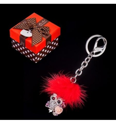 Модерен дамски ключодържател с червен пух от естествен косъм, бухалче с кристали и роза. Подходящ аксесоар за дамска чанта и раница. Ключодържателят е с дължина 13см. Цената включва луксозна подаръчна кутия с размери 8,8см. х 8,8см., височина - 6см. Прекрасен подарък за любим човек.
