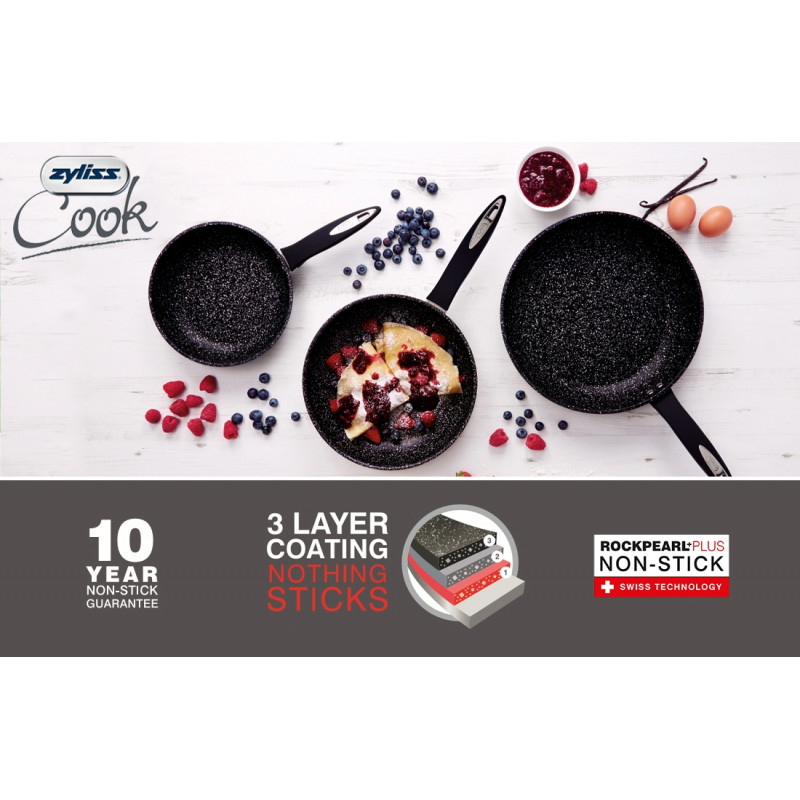Всички съдове от серия COOK на Zyliss се отличават с незалепващо покритие ROCKPEARL + PLUS Non-Stick SWISS Technology, което е ИЗКЛЮЧИТЕЛНО издръжливо и не съдържа PFOA - перфлуороктанова киселина. Технологията ROCKPEARL прави съдовете по-издръжливи и позволява да използвате метални прибори за готвене и напълно елиминира необходимостта от използване на мазнина. Така Вие ще приготвяте вкусна, но и много здравословна храна за Вас и Вашето семейство.Всички съдове от серия COOK на Zyliss са подходящи за всички видове котлони, включително индукционни, както и за фурна и грил ( максимум до 180º ).Почистване: След всяка употреба почиствайте с топла вода и препарат за съдове. Не използвайте агресивни и абразивни препарати  и химикали.Можете да миете и в съдомиялна машина