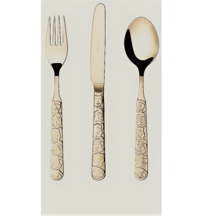 HERDMAR Комплект прибори за хранене " ROSAS" за 6 човека от 24 части - позлатен  • Изработени от неръждаема стомана • Подходящи за почистване в съдомиялна машина. • Позлатени с 24 каратово злато (със сертификат )  Комплектът включва: • Нож за хранене: 6 бр. • Вилица за хранене: 6 бр. • Лъжица за хранене: 6 бр. • Десертна лъжичка: 6 бр. ПРОИЗВОДИТЕЛ: HERDMAR / Португалия