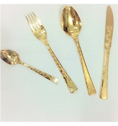 HERDMAR Комплект прибори за хранене "NAMISH" за 6 човека от 24 части - позлатен  • Изработени от неръждаема стомана • Подходящи за почистване в съдомиялна машина. • Позлатени с 24 каратово злато (със сертификат )  Комплектът включва: • Нож за хранене: 6 бр. • Вилица за хранене: 6 бр. • Лъжица за хранене: 6 бр. • Десертна лъжичка: 6 бр. ПРОИЗВОДИТЕЛ: HERDMAR / Португалия