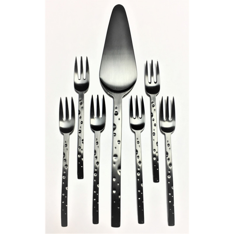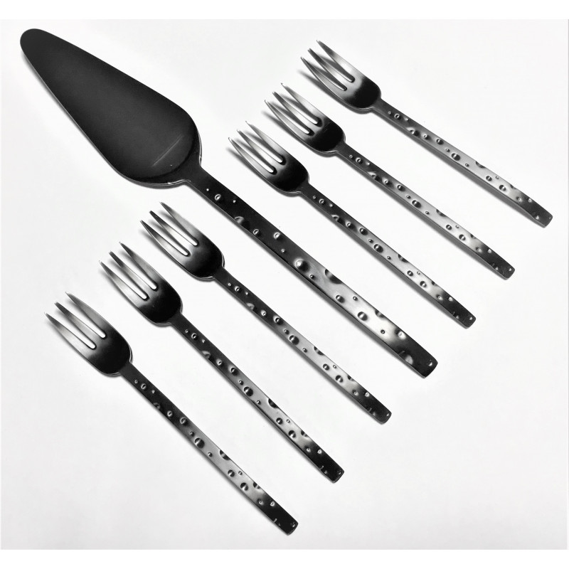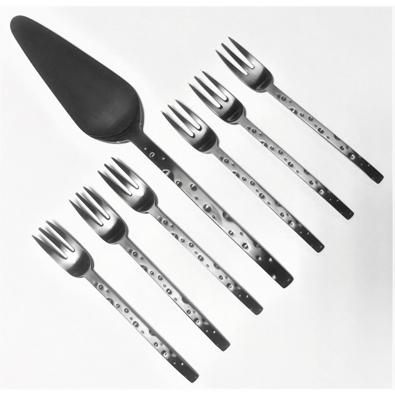 HERDMAR Комплект прибори за торта “CHEESE“ - 7 части - с PVD покритие черно/мат • Изработени от неръждаема стомана 18/10• PVD покритие. Комплектът включва:• Вилица за торта: 6 бр. • Лопатка за сервиране: 1 бр. Производител: HERDMAR / Португалия