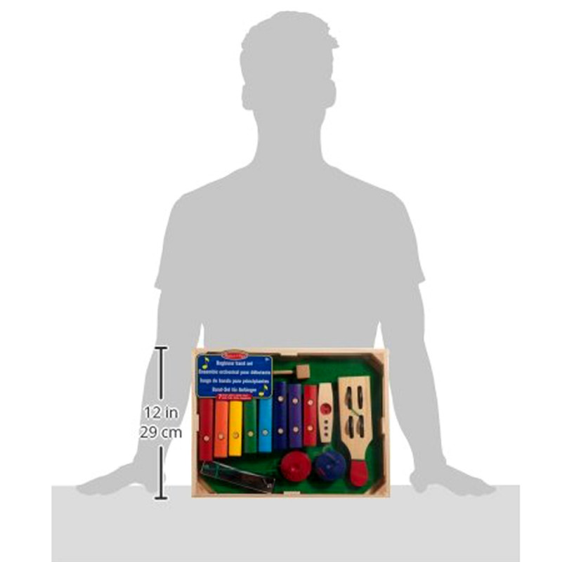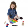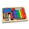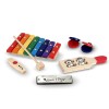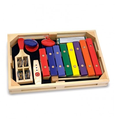 Подарете цветно въвеждане в света на музиката. Комплекта включва ксилофон, казу, кастанети, хармоника, jingle stick, всички грижливо прибрани в дървена кутия. Провокира интереса към музика и стимулира фината моторика.