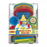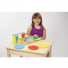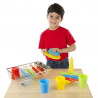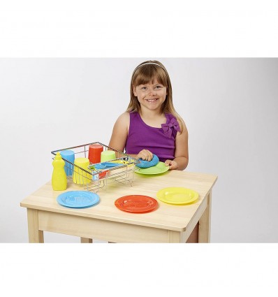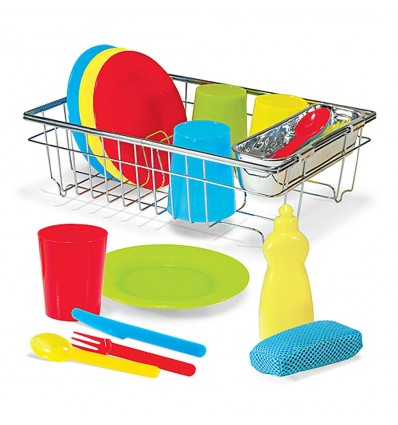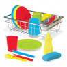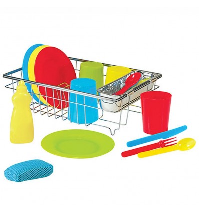 Наредете масата с този комплект за хранене и въображаеми игри. Той се състои от 4 чинии, 4 чаши, 4 вилици, лъжици и ножове, бутилка за изстискване на препарат за миене, гъба за миене, метален отцедник с отделение за приборите за хранене. Комплекта наподобява истински кухненски комплект. Спомага за социализацията, игрите сред приятели или въображаемите игри у дома.