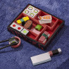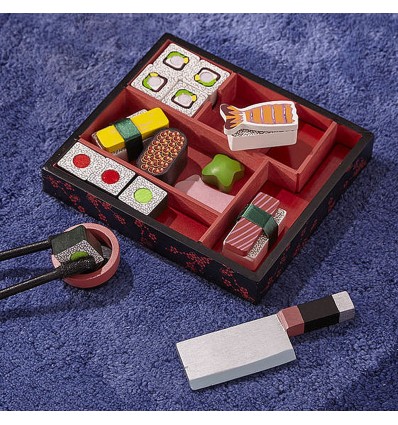 Малки и големи любители на сушито - добавете уасаби, ако искате! Елегантният мини комплект се състои от 24 суши парчета пакетирани в красива кутия. Комплекта включва суши рулца за рязане, скариди, риба тон, касапски сатър (декоративен) и комплект пръчици за хранене. Парчетата, които могат да се "режат" са залепени с велкро лепенка и при рязането се чува реалистичен звук.