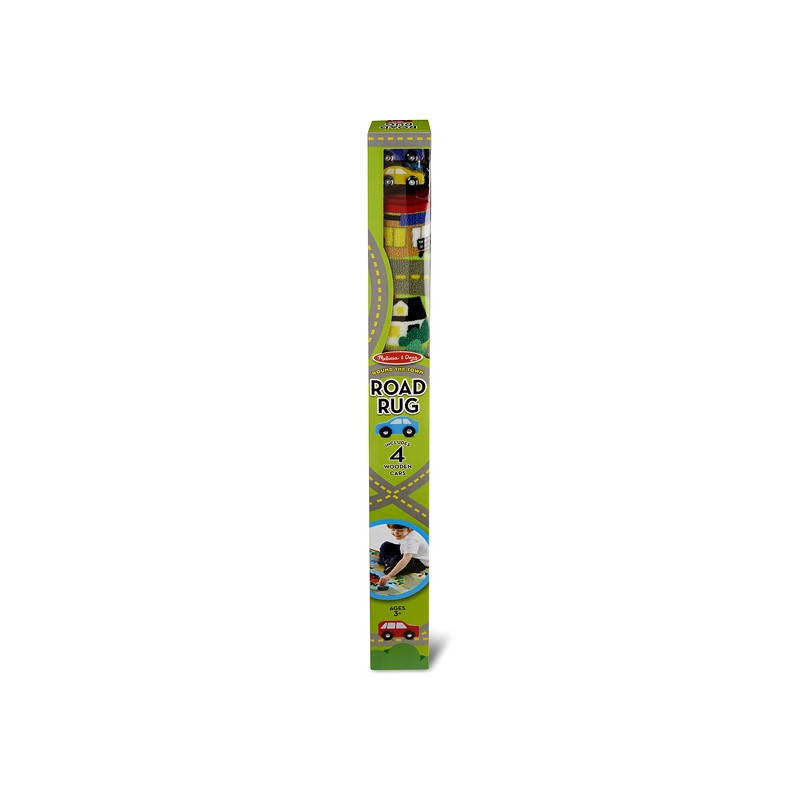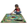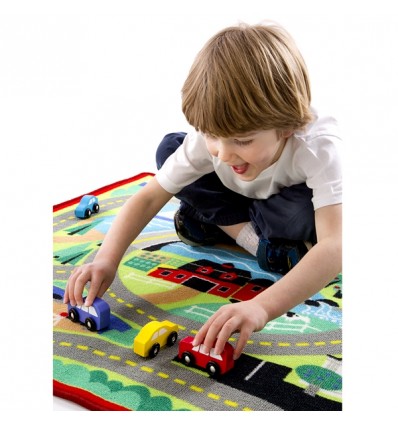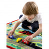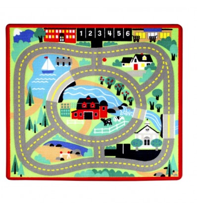 Това цветно килимче ще издържи безбройните часове детски игри. Към него има 4 дървени колички. То е декорирано с ферма, свързана с училище, паркинг, магазин и езеро чрез пътища, както и числата до 6. Отдолу то има специално покритие, намаляващо плъзгането, а страничните шевове запазват целостта и предпазват от протриване и разкъсване.