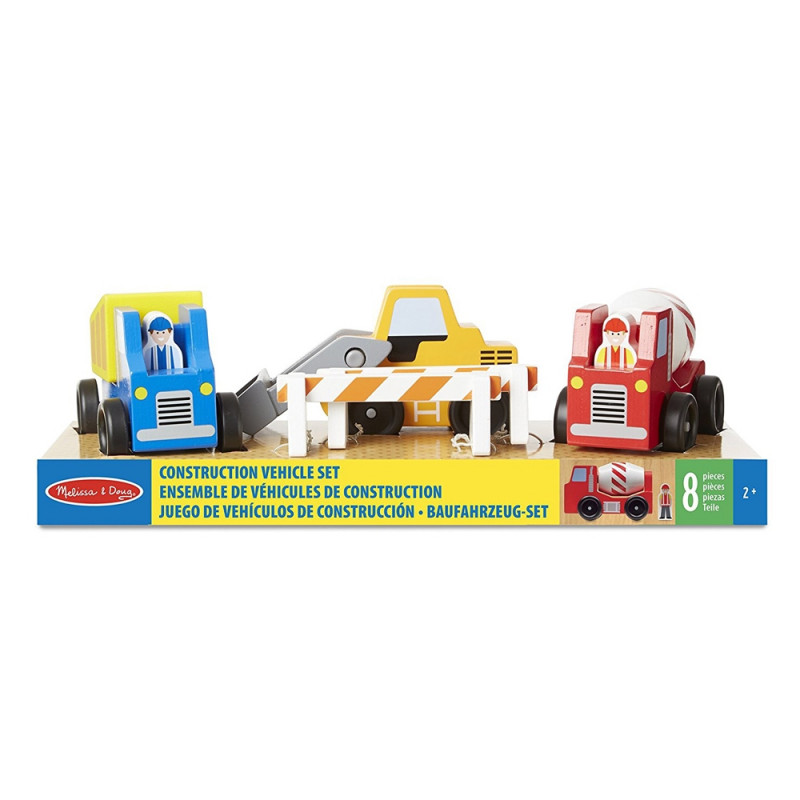 Комплекта се състои от 3 броя детски строителни машини с истински въртящи се колела, 2 фигурки на шофьори и 2 бариери за въображаеми игри.