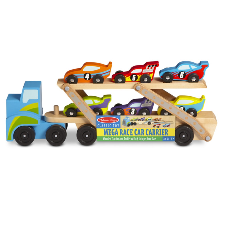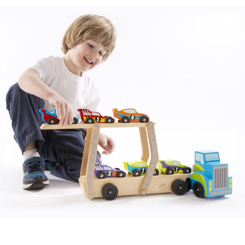 Големият детски автовоз пристига натоварен с шест уникални състезателни автомобила и безброй възможности за забавна игра. Той има два етажа, на които да бъдат натоварени колите. Горният етаж е подвижен и само с едно движение може да се разгъне и така автовозът да стане по-висок. Всяка от състезателните колички може да се закрепи стабилно върху него, за да не изпада. Автомобилите могат да се бутат самостоятелно и отделно от автовоза. Те са цветни и номерирани, така че децата да научат числата, както и да броят, докато играят.