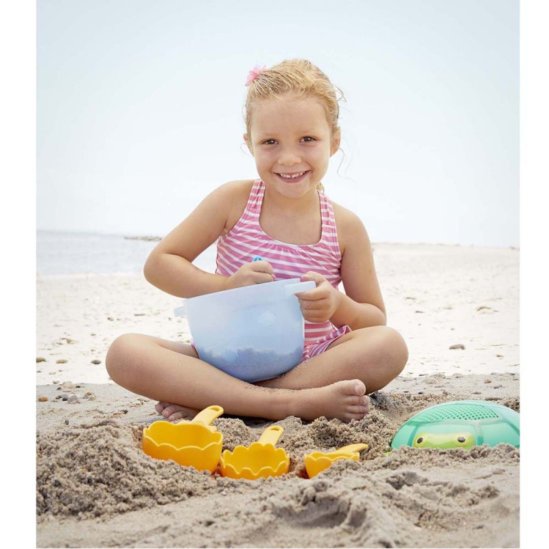 С този плажен комплект за готвене и инструментите в него детето може  да прави пайове от кал, пясъчни сандвичи и др. Младите готвачи ще харесат използването на трите черпаци - мидени черупки, бъркалката-октопод и лъжицата-рак. Капака-костенурка е и сито.