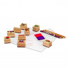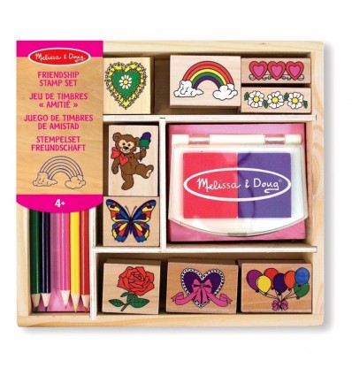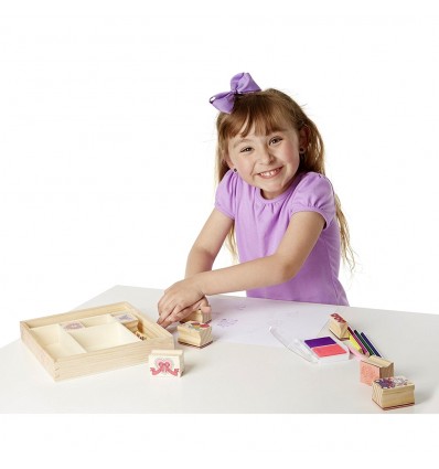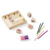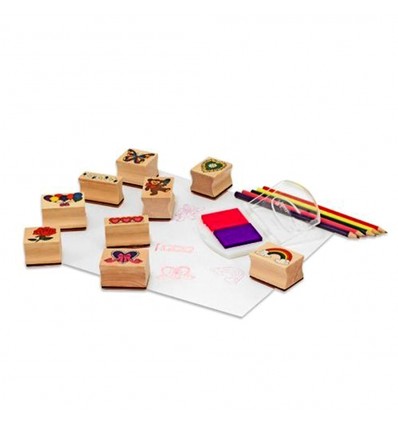 Децата ще харесат заниманията с 8-те печата (с дъга, сърца и др.) и двата цвята мастило. С тях могат да се създават безброй различни картинки и да се оцветяват с 5-те цветни молива. Мастилото може да се изпира от дрехи и е нетоксично. Всяко нещо от комплекта се прибира в своето отделение на здравата дървена кутия. Ценен комплект, който може да се ползва отново и отново.