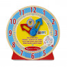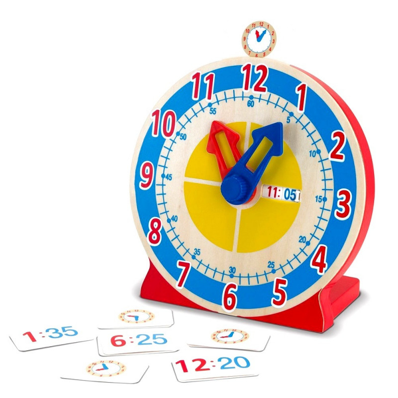 Melissa and Doug Дървен часовник е специално разработен за един от най-важните уроци - разпознаването на часовника. Може да се учи по стрелки и с числа (те са автоматично свързани). В комплекта са включени и 13 карти за упражнение, по които детето да наглася часовника - червена стрелка за часове и синя за минути.