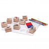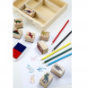 Тематичен комплект печати с всичко необходимо, за да се създават цветни картинки с диозаври. В творческия комплект може да се избира между 2 цветни тампони с миещо, безопасно за деца мастило, 8 детайлни печата с динозаври и 5 цветни молива. Всичко това е прилежно прибрано в кутия за съхранение, за да не се пръскат и губят. Дървените печати с формата на динозаври са страхотни за украсяване на тетрадки, оцветяване в рисунки, създаване на истории и др.