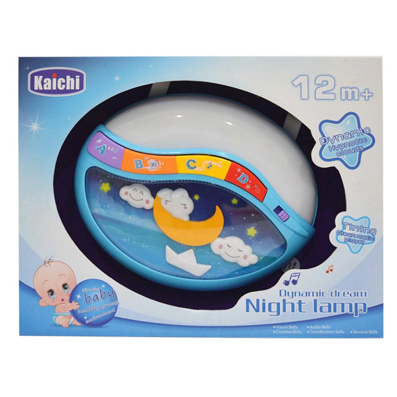 Функции: нежни, успокояващи мелодии и звуци, сменящи се светлини, възможност за работа без мелодии (режим D), плаващи фигурки (облачета, луна и корабче), бутон за регулиране силата на звука, бутон ON/OFF. Лампата е заредена с необходимите батерии.