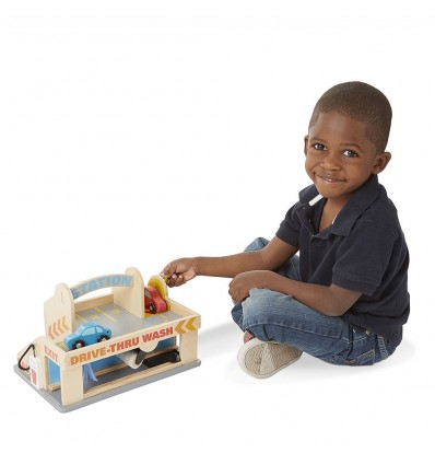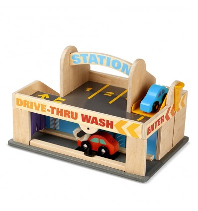 Този автосервиз предлага пълно обслужване. Паркирайте двете дървени колички в подвижния асансьор или ги прекарайте през автомивката. Не забравяйте да заредите гориво. Заниманията стимулират въображаемите игри, фината моторика на ръцете, координацията око-ръка. Вградената дръжка - надпис Service улеснява пренасянето.