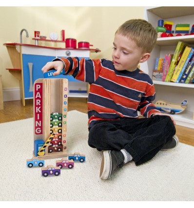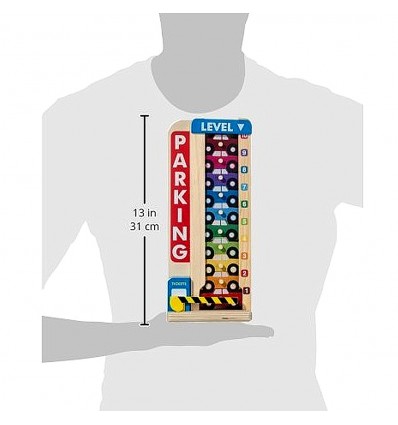 Melissa and Doug Дървен паркинг с коли е вертикален, с десет паркоместа и съответно толкова колички. Те са разноцветни и всяко число е в съответен цвят. Детето трябва да прецени коя кола, върху коя да поставя, в зависимост от числото. На изхода има бариера, която пропуска колите, а движещата плоскост LEVEL показва до коя поцизия сте стигнали.