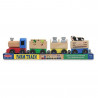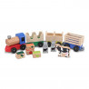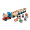 Комплекта е изработен от дърво и включва: локомотивче с 3 вагона + крава, 2 везни и 4 кубчета.