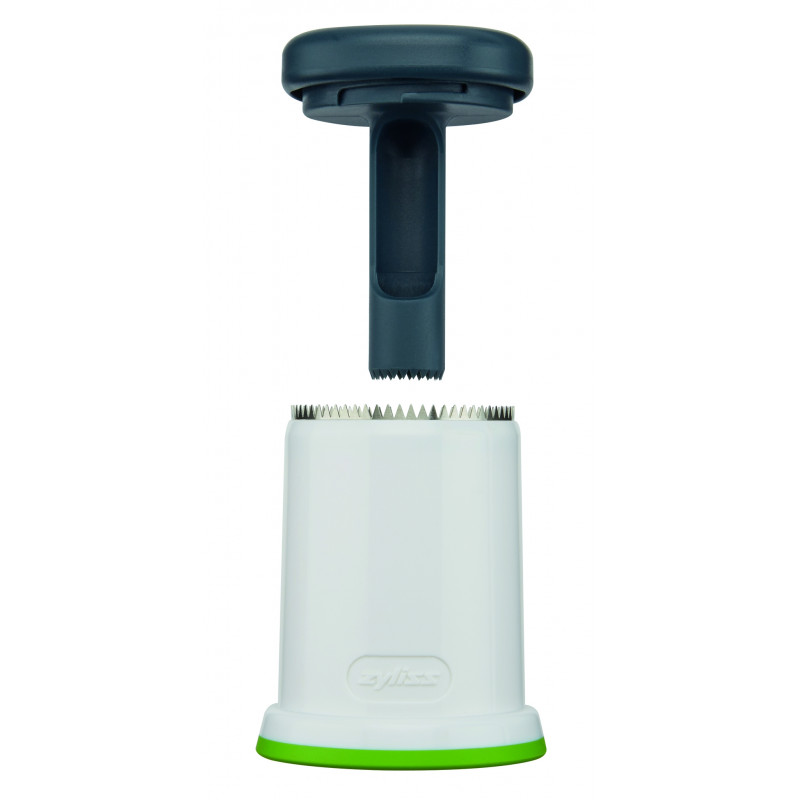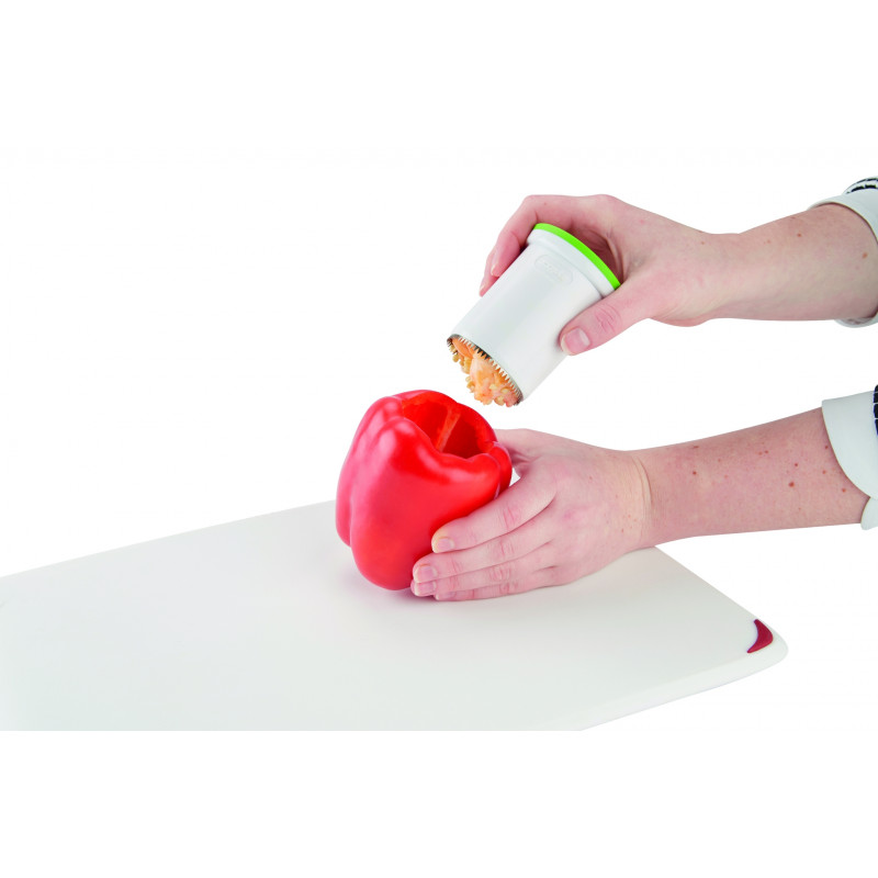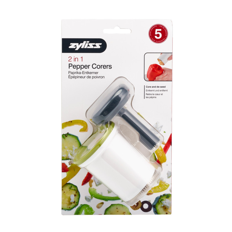 Практичен прибор за почистване на чушки, лесен за употреба и почистване. Идеален за чистене на камби и чушки халапеньо. Назъбените остриета лесно преминават през ципата на чушката. Малкият и големият прибор се прибират един в друг за по- удобно съхранение.