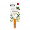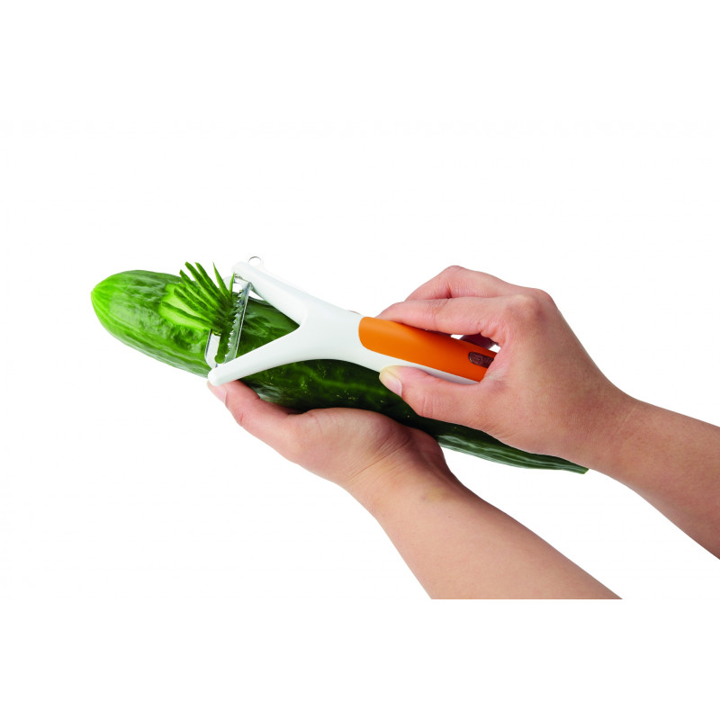 Резачка с висококачествено стоманено и специално назъбено острие за ефективно нарязване на жулиени от краставици, тиквички, моркови и др. зеленчуци. Подсиленото острие от неръждаема стомана остава остро, дори след дълга употреба. Кръглата приставка отстрани ефективно премахва недостатъците по зеленчуците.