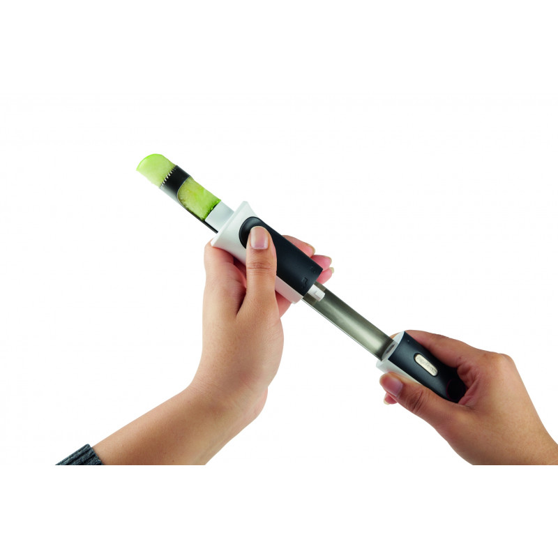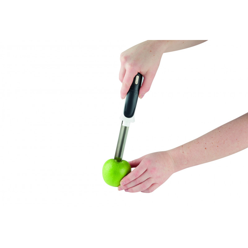 С този практичен и удобен прибор ще премахнете сърцевината на ябълките бързо и ефективно, без никакво усилие. Едновременно се наслаждавате на вкусни плодове, като и по-малко разхищавате от тях, при почистването им. Чрез плъзгащото се бутало избутвате сърцевината от оста, запазвайки работния плот и кунята чисти.