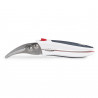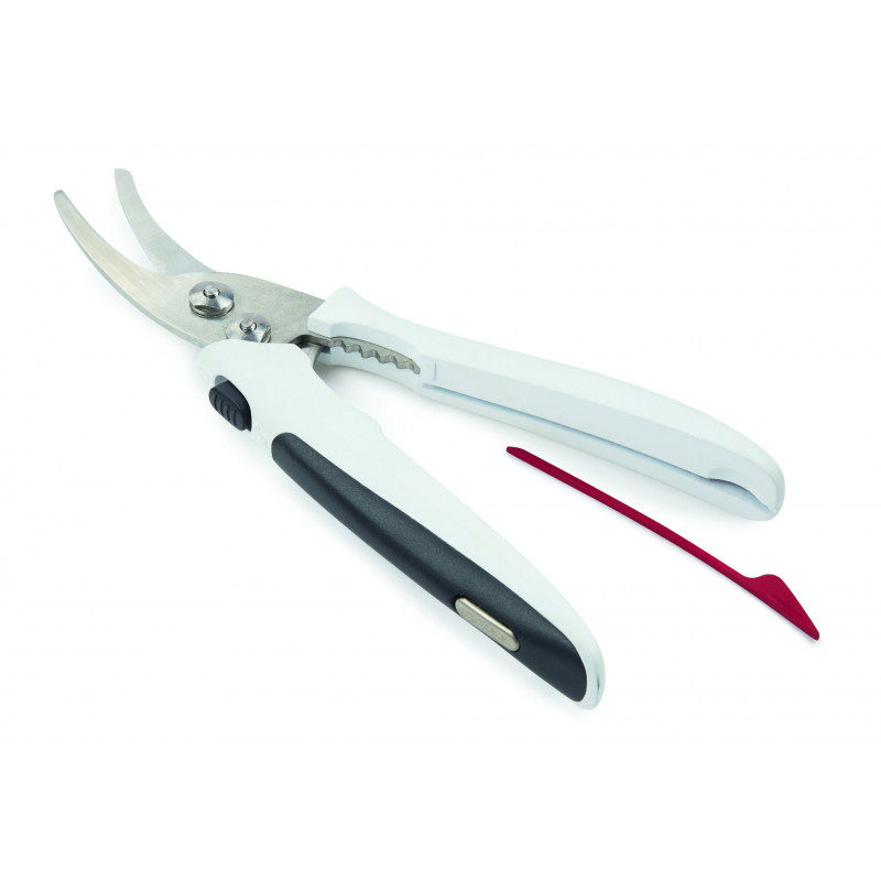Всяка кухня има нужда от кухненски аксесоари, които са компактни, но мултифункционални. Такъв аксесоар е ножицата за месо и морски дарове на Zyliss.Режещият ѝ механизъм е задвижен от повече сила, отколкото на обикновена ножица. Извитите назъбени остриета режат черупки на морски дарове, без да повреждат месото им. Към ножицата има включен и прибор за почистване. С ножицата можете също и да чупите орехи, благодарение на вградената в едната ѝ дръжка орехотрошачка. Лесно и безопасно съхранение, благодарение на функцията за заключване на дръжките. Внимание: Опасни остриета! Използвайте с повишено внимание!