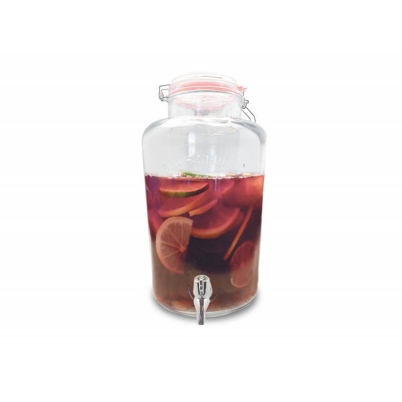 Чашата Ви никога не ще остане празна с този огромен диспенсър за напитки! Вдъхновен от традициите на домашно приготвените напитки, дизайнът на този диспенсър пресъздава огромен буркан. Изработен от дебело, висококачествено стъкло, с капак, който се затваря плътно с клипс. Широко гърло, за лесно добавяне на лед, плодове, листа мента и всички други добавки към питието Ви. Наливането става бързо и лесно посредством симпатично кранче, разположено в долната част на диспенсъра.